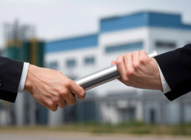 Due persone in abito formale che si passano un testimone d’acciaio davanti a un’azienda sfocata – concetto di passaggio generazionale PMI