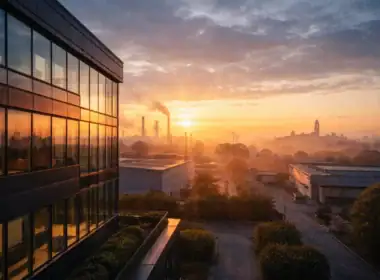 Previsioni economiche 2026; distretto industriale italiano all’alba con edificio direzionale moderno in vetro e acciaio, fabbriche sullo sfondo e luce dorata del sole nascente.